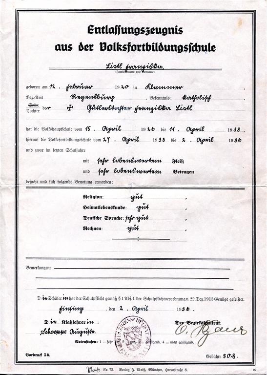Am 06. April 1933 beendete Franziska die Volkshauptschule in Sulzbach an der Donau. Sie verlässt die Schule nach dem 7. Schullehrjahr mit der Bemerkung "Musterschülerin"