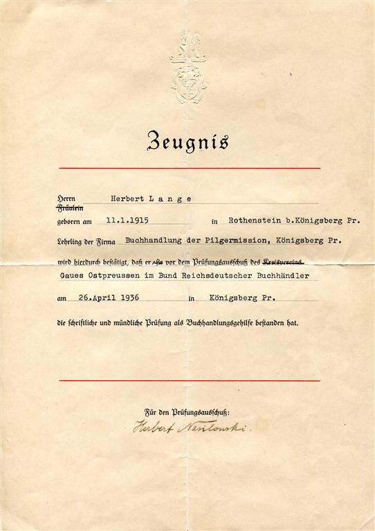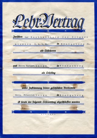 Am 01. September 1933 unterschreibt Herbert seinen Lehrvertrag als Buchhandelsgehilfe in der Buchhandlung der Pilgermission GmbH, Filiale Königsberg. Die Lehrzeit dauert 3 Jahre und somit bis zum 31. August 1936. Er erhält in seinem 1. Lehrjahr als Entschädigung 17 Reichsmark monatlich. Versichert ist er im deutschen Handlungsgehilfen Verband, Berufskrankenkasse des Kaufmannsgehilfen, Hamburg. Der monatliche Betrag sind 1,20 Reichsmark am Anfang, ab April 1934 steigt dieser auf 1,25 Reichsmark monatlich.
