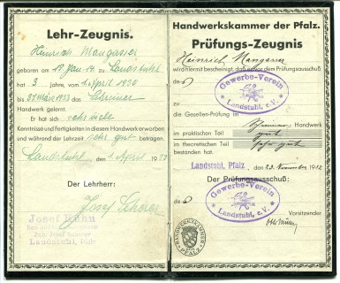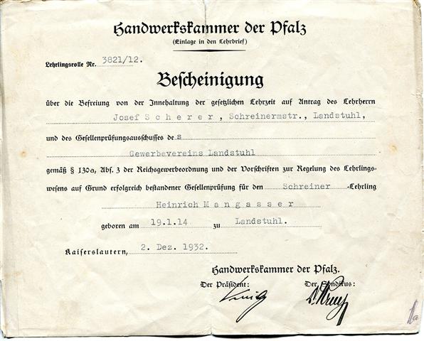 Vom 1. April 1930 bis zum 31- März 1933 absolvierte Heinrich Mangasser in der Bau- und Möbelschreinerei Josef Kühn in Landstuhl seine Lehre als Schreiner. Sein Lehrherr ist Josef Scherer, der die Schreinerei besitzt. Bereits am 23. November 1932 hatte er seine Gesellenprüfung vor dem Prüfungsausschuss der Handwerks Kammer der Pfalz und bestand diese mit sehr guten Noten. Daraufhin erhielt er die Bescheinigung über die Befreiung von der Innehaltung der gesetzlichen Lehrzeit auf Antrag des Lehrherrn Josef Scherer, Schreinermeister in Landstuhl.