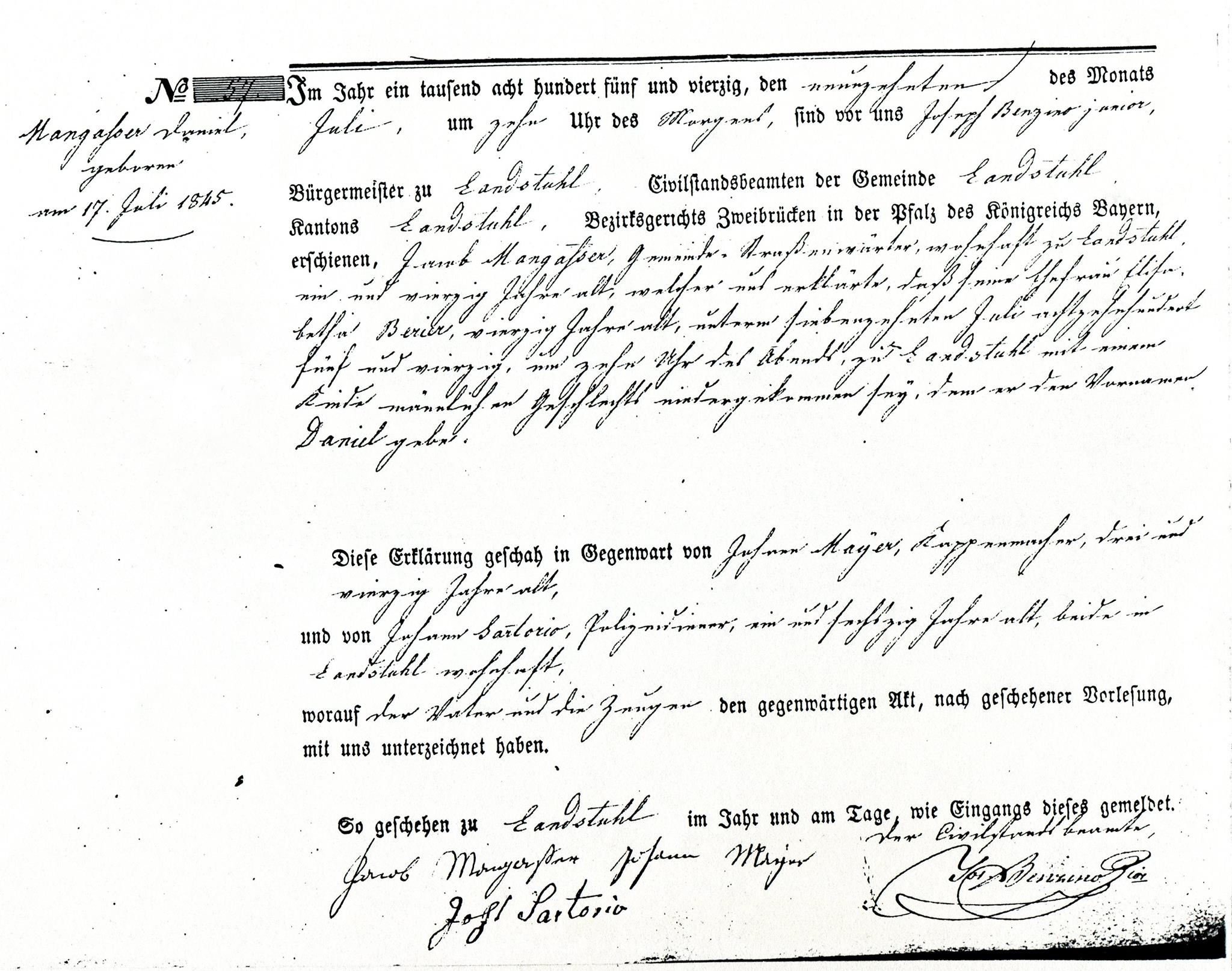 Daniel Mangasser wird am 17. Juli 1845 als Sohn von Jacob Mangasser und Elisabeth Berje in Landstuhl geboren.
