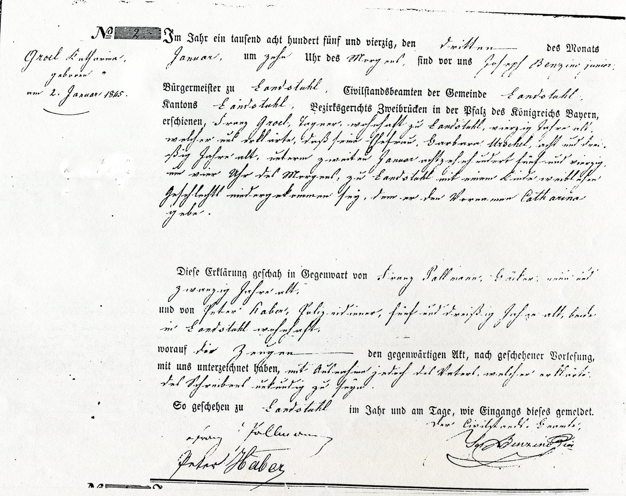 Katharina Groel wird am 02. Januar 1845 als Tochter von Franz Groel und Barbara Urschel in Landstuhl geboren.