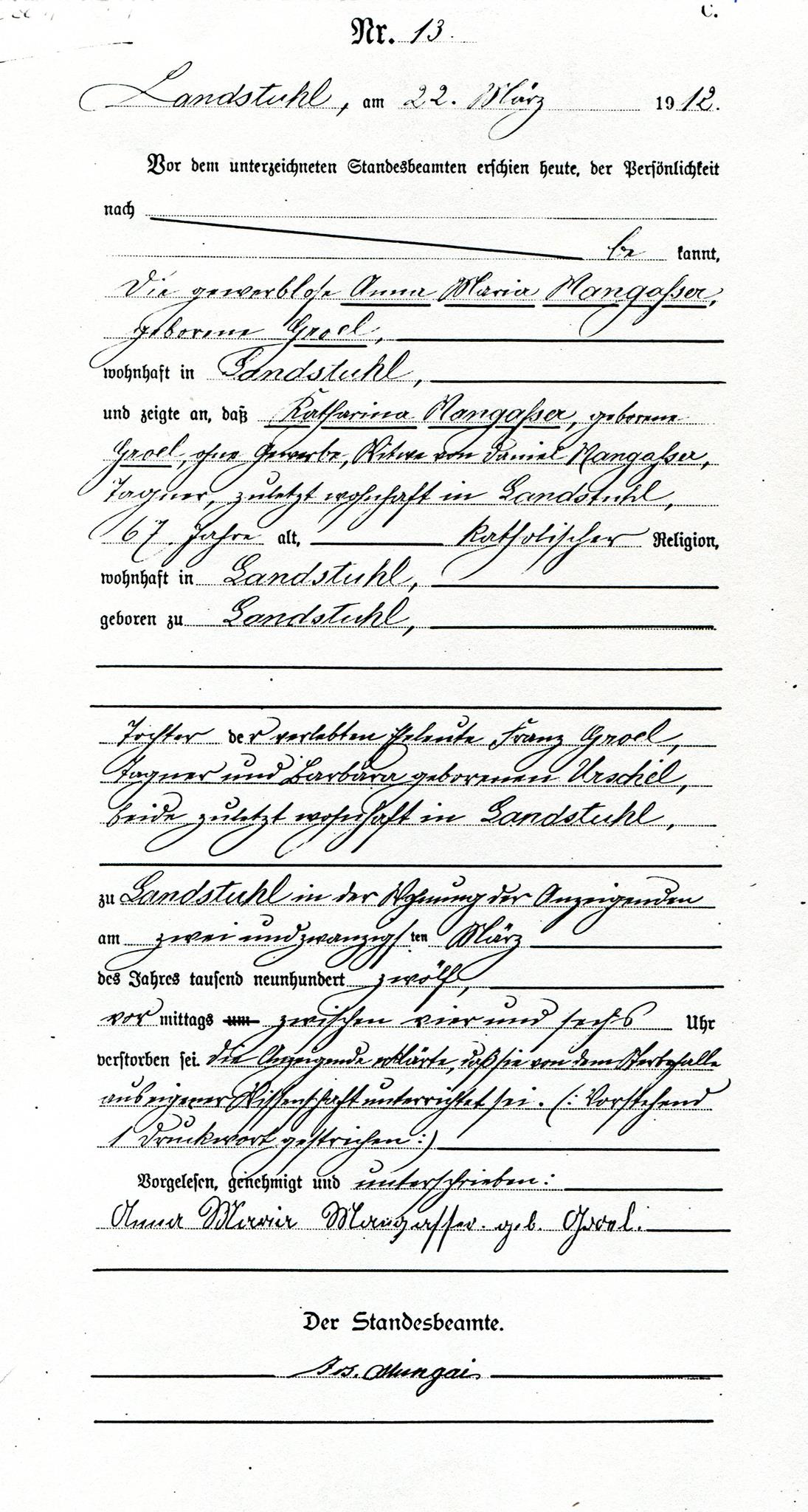 Katharina Groel verstirbt am 22. März 1912 in Landstuhl