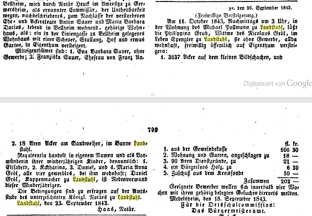 Landstuhl, den 23. September 1843 (Quelle: https://books.google.de/books?id=5PZEAAAAcAAJ&pg=PA799&dq=Landstuhl%2BGroel&hl=de&sa=X&ei=2z2kVIDJFMztaMuogZgD&ved=0CCsQ6AEwAA#v=onepage&q=Landstuhl%2BGroel&f=false)