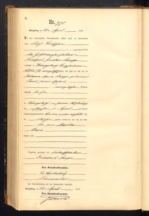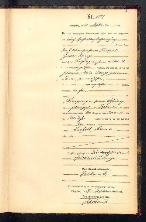 Mein Urgroßvater Friedrich Gustav Lange heiratet am 24.3.1902 standesamtlich und am 31. März 1902 kirchlich seine Frau Marie Johanna Faust. Als Zeugen sind dabei der Arbeiter August Mintz, 26 Jahre alt und Friedrich Reith, 57 Jahre alt. Alle wohnten zu dieser Zeit bereits in Königsberg. Bei seiner Mutter ist angegeben, dass sie als Instmannfrau in Perbanden wohnt.