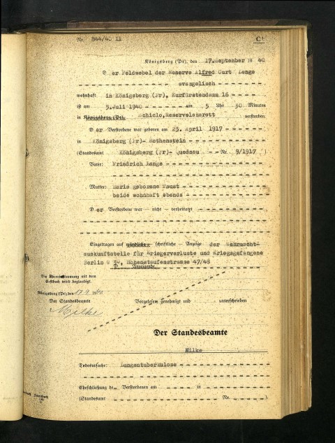 Alfred verstirbt im Zweiten Weltkrieg im Reservelazarett in Schilo an Lungentuberkulose. Er diente als Feldwebel bei der Luftwaffe. Seine Beerdigung fand allerdings in Königsberg statt.