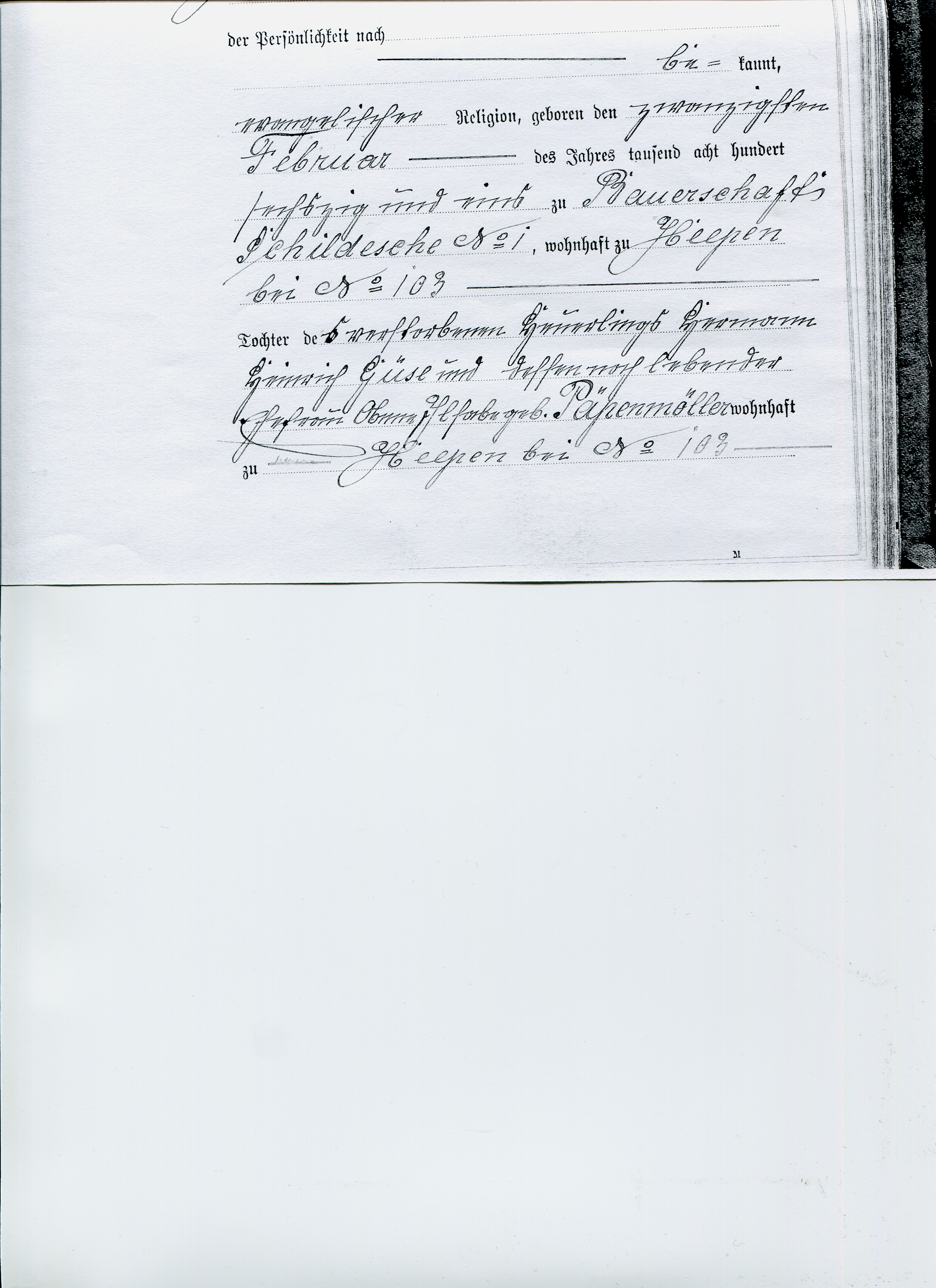 Johanne (Anne Marie) Güse wird am 20. Februar 1861 als Tochter von Hermann Heinrich Güse und Anna Ilsabe Papenmoeller in Bielefeld-Schildesche geboren.