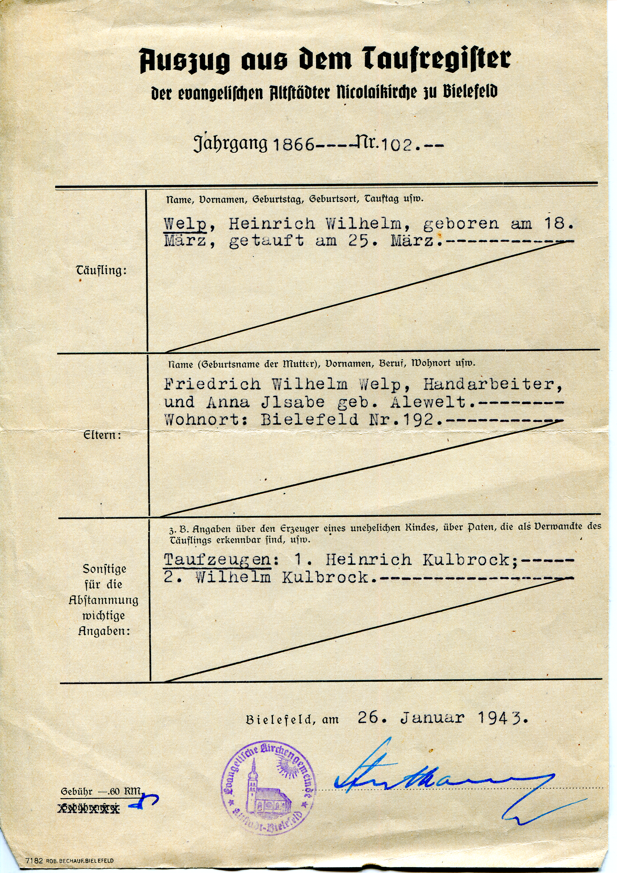 Heinrich Wilhelm Welp wird am 18. März 1866 in Bielefeld als Sohn von Friedrich Wilhelm Welp und Anna Alewelt geboren.