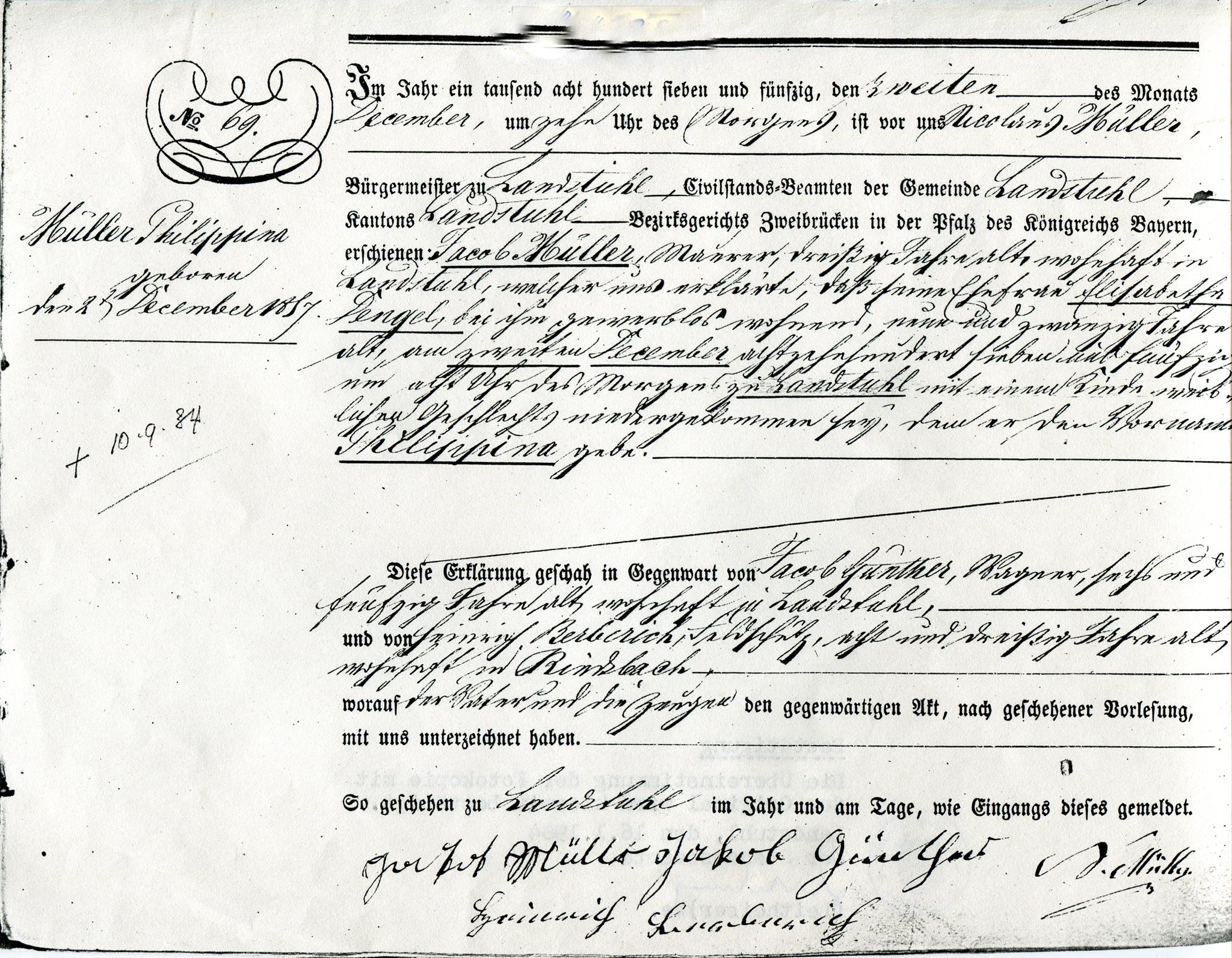 Philippina Müller wird am 02. Dezember 1857 als Tochter von Jakob Müller und Marie Elisabetha Dengel in Landstuhl geboren.