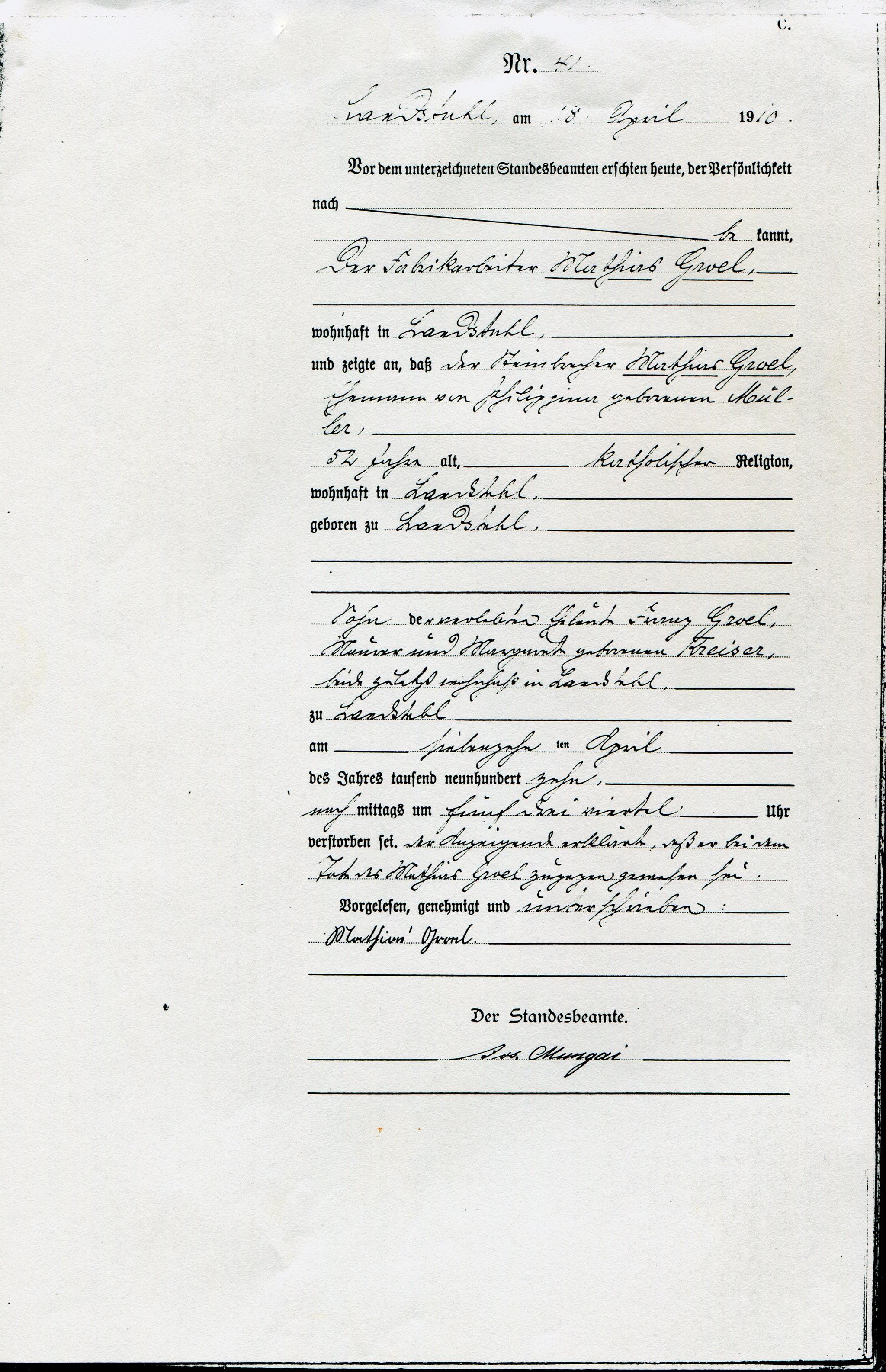 Matthias Groel stirbt am 17. April 1910 in Landstuhl
