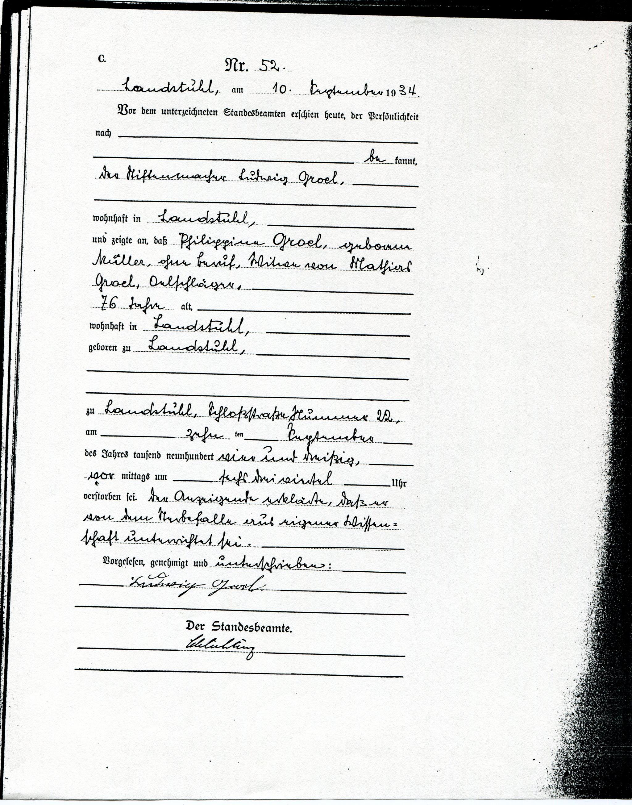 Philippina Müller stirbt am 10. September 1934 ebenfalls in Landstuhl