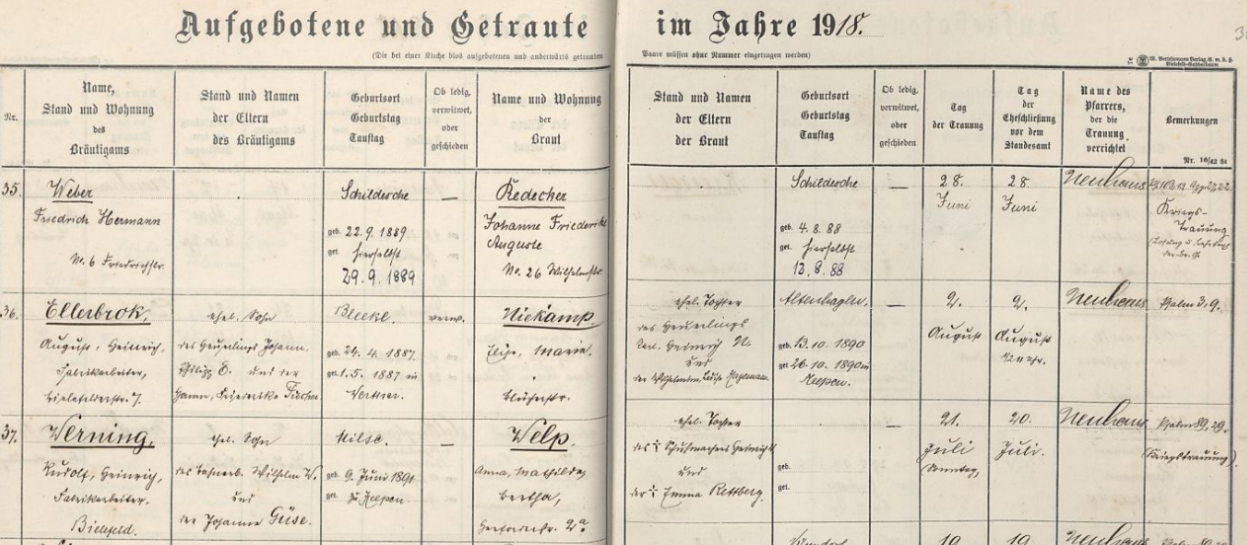 Heinrich Philip Rudolf Werning heiratet am 20. Juli 1918 und einen Tag später kirchlich in Bielefeld seine Frau Anna Mathilde Bera Welp. Im Trauregister wird als sein Beruf Fabrikarbeiter angegeben.