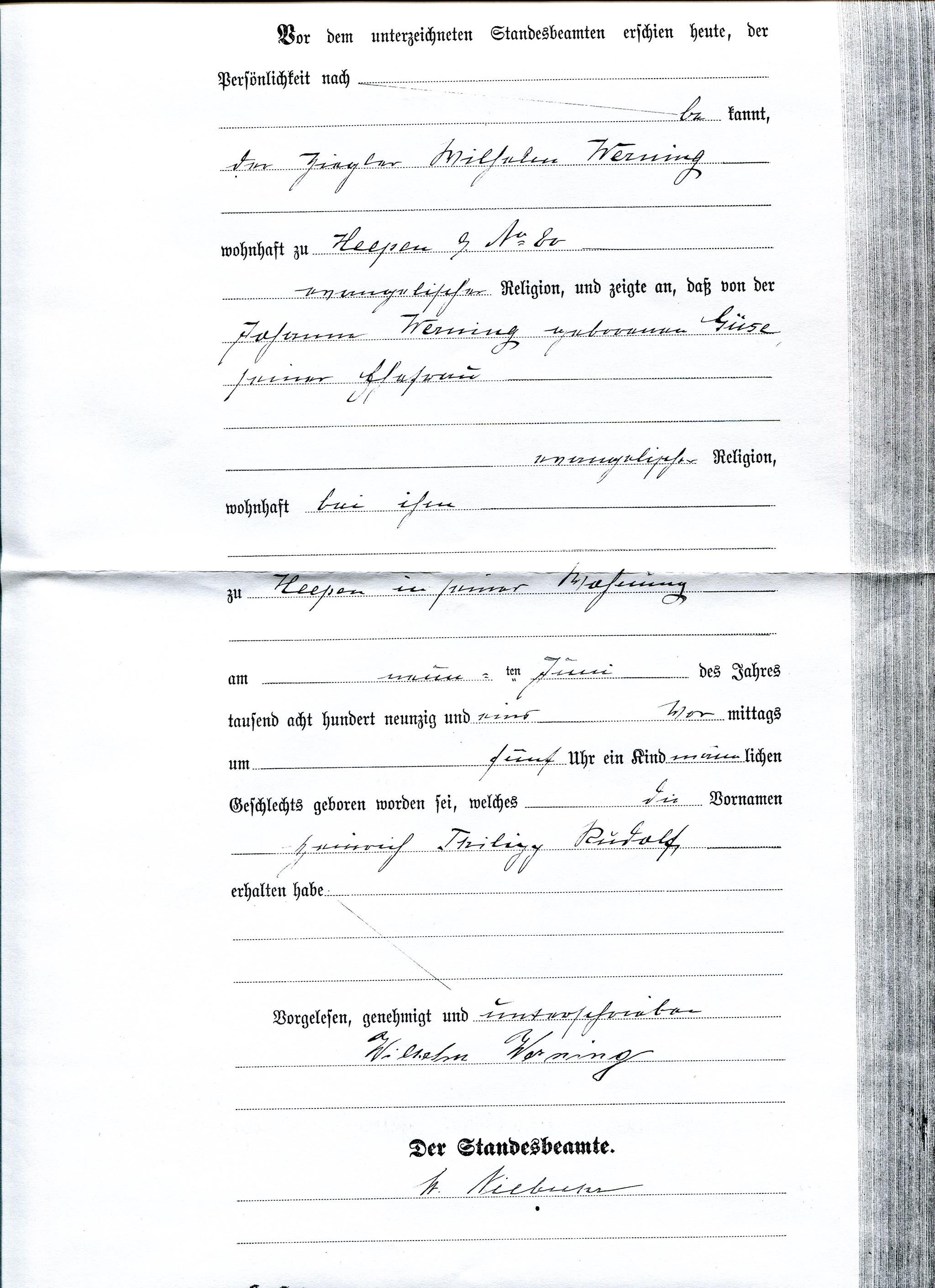 Mein Urgroßvater Heinrich Philip Rudolf Werning wird am 09. Juni 1891 als Sohn von (Friedrich) Wilhelm Werning und Johanne Güse in Bielefeld-Heepen geboren und am 05. Juli 1891 getauft. Seine Taufpaten waren Heinrich Werning aus Milse und Philipp Güse aus Bielefeld.