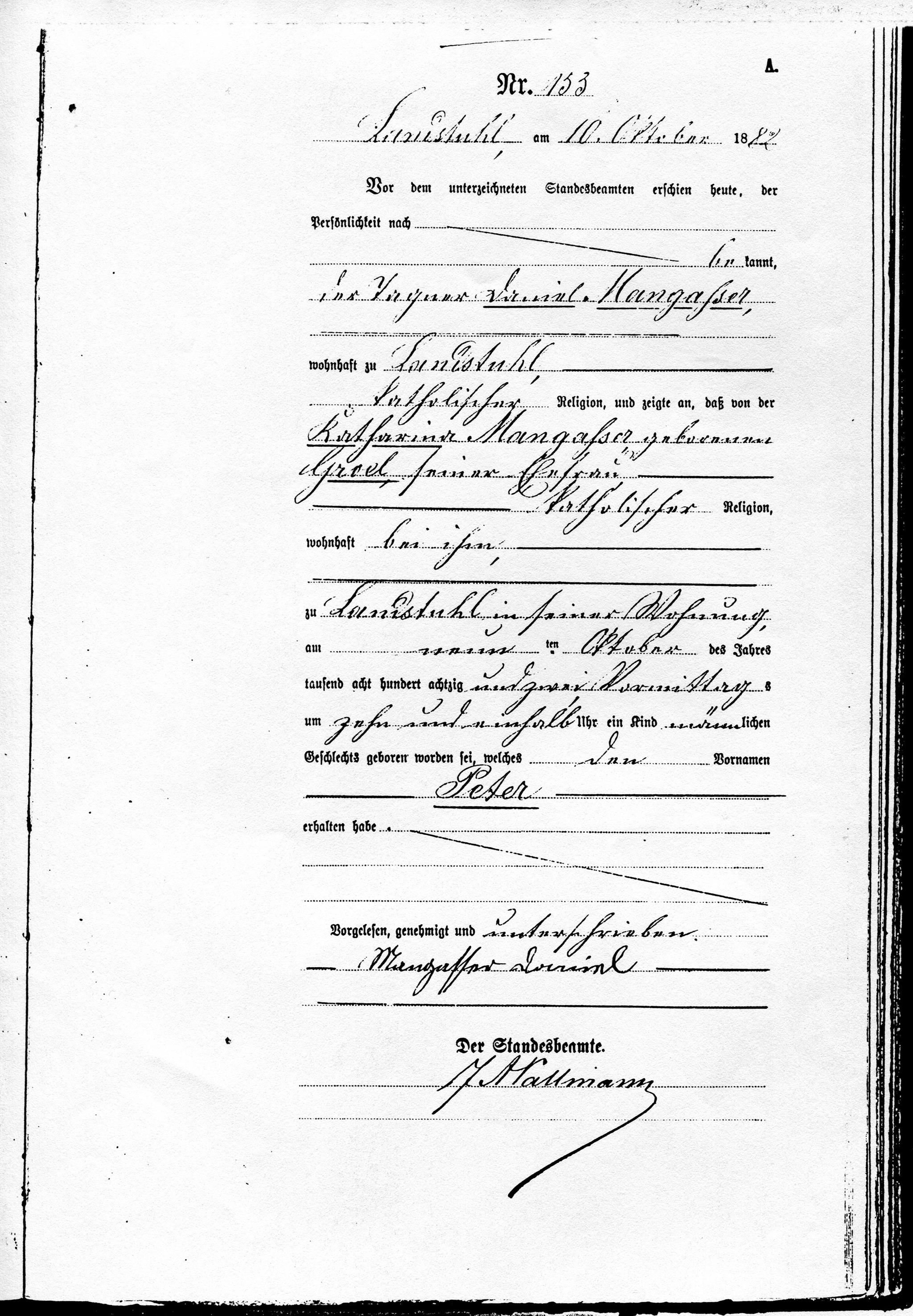 Mein Urgroßvater Peter Mangasser wird als Sohn von Daniel Mangasser und Katharina Groel am 09. Oktober 1882 in Landstuhl geboren.