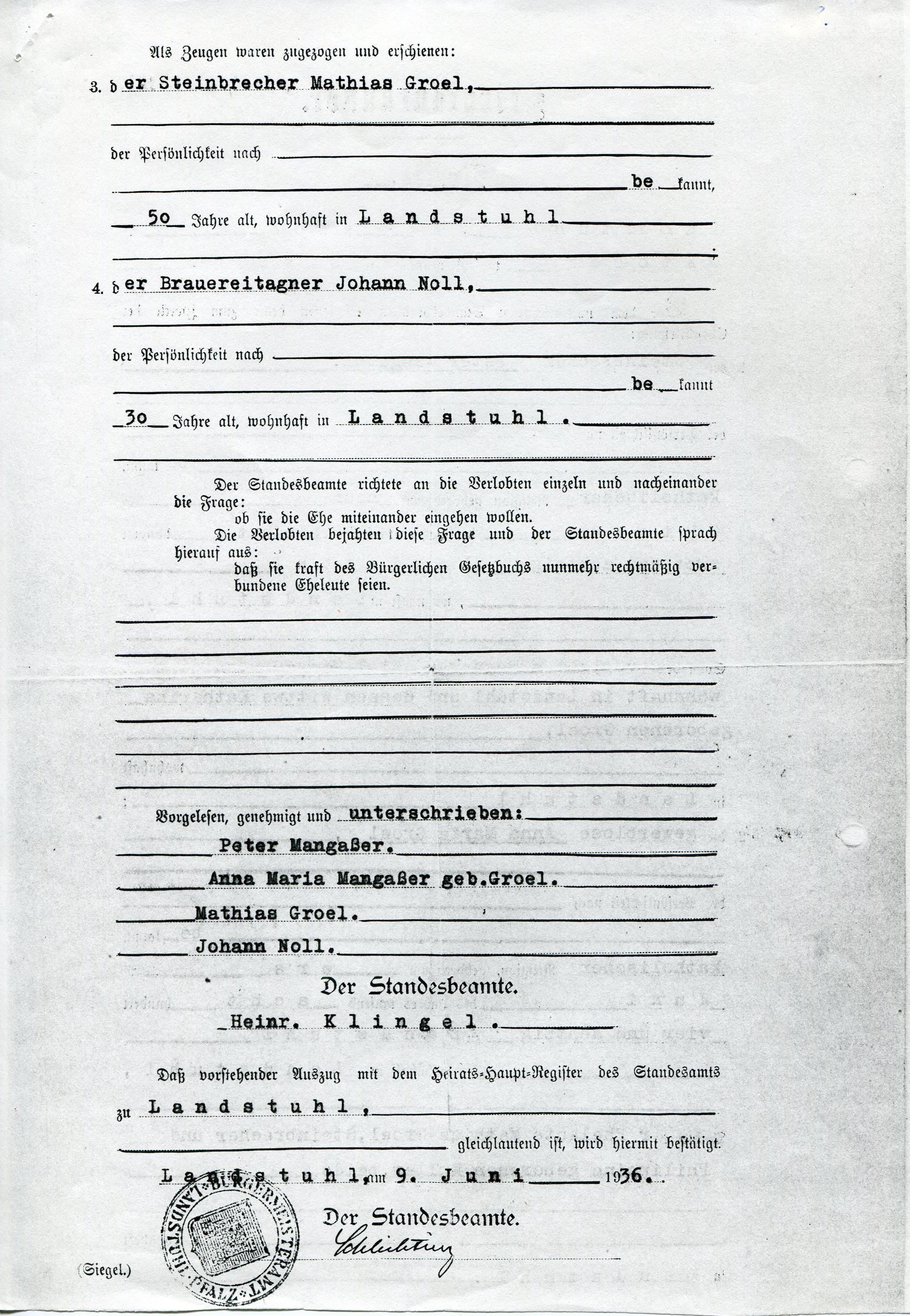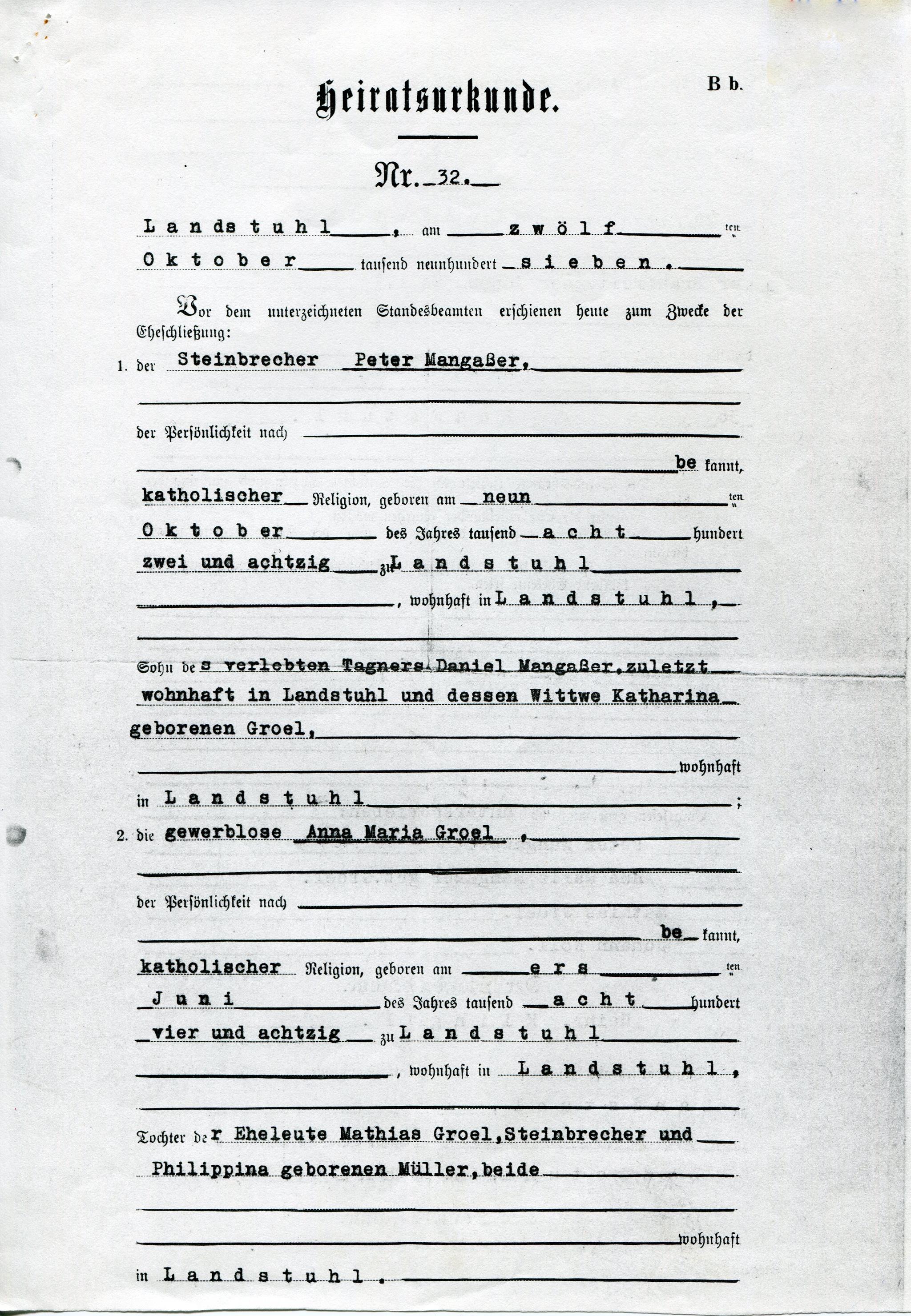 Peter Mangasser heiratet am 12. Oktober 1907 in Landstuhl seine Frau Anna Maria Groel.
