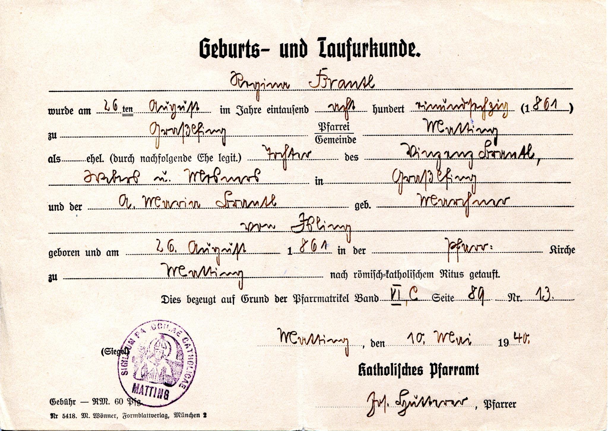 Regina Brantl (Brandl) wurde am 26. August 1861 als Tochter von Wolfgang Brantl (Brandl) und Anna Maria Marchner in Graßlfing geboren.
