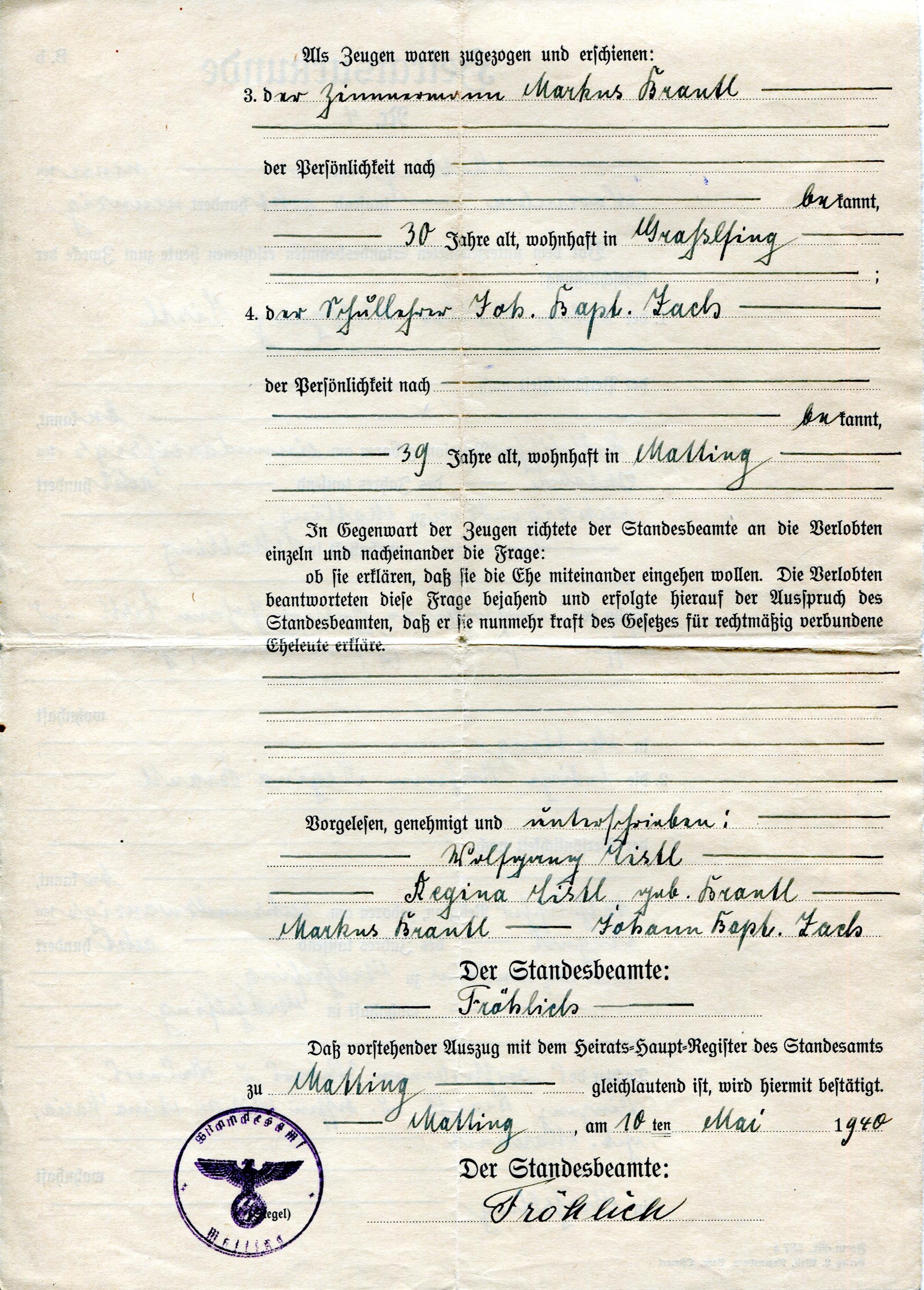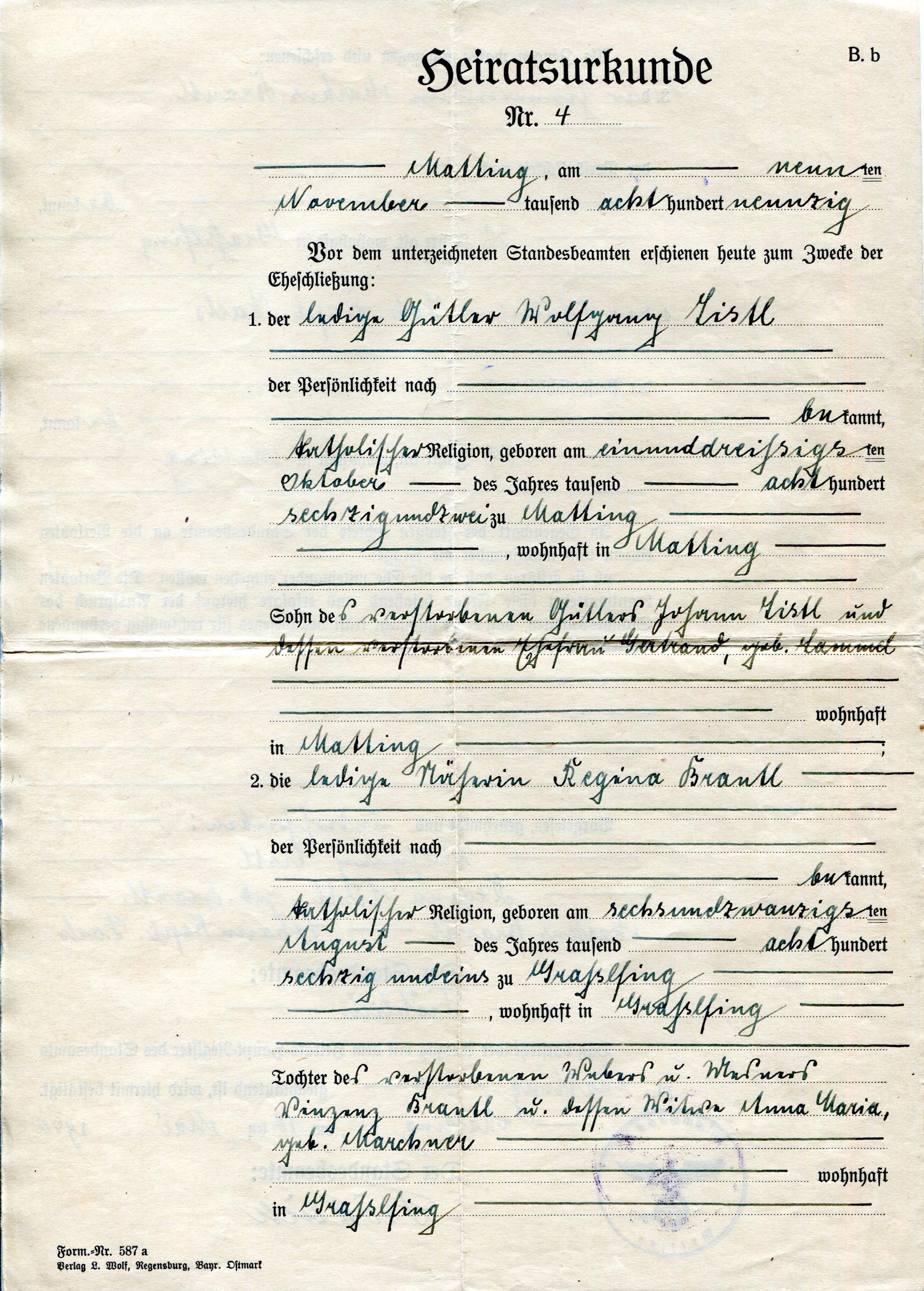Wolfgang Listl heiratete am 19. November 1890 in Matting seine Frau Regina Brandl.